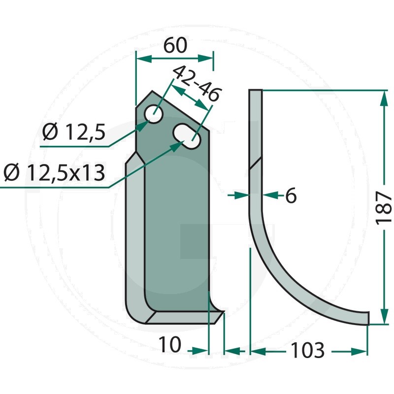 Frézovací zahnutý klenutý nůž rotavátoru Goldoni o rozměru 187 x 103 x 60 x 6 mm