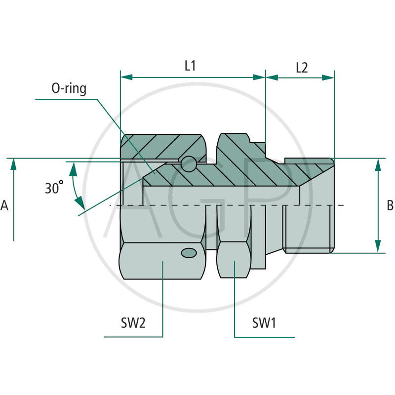 Přípoj 2: vnitřní válcový závit, 30° těsnící kužel
