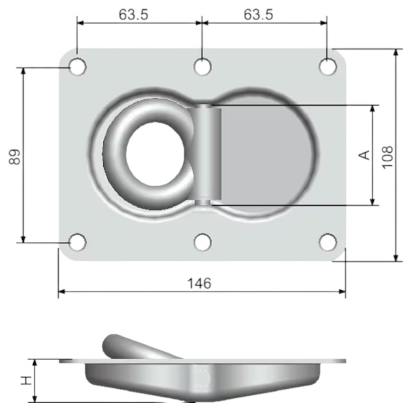Robustní kotevní / kotvící miska určená k zapuštěné montáži do podlah přívěsů, dodávek, valníků, návěsů a další dopravní techniky. Slouží k bezpečnému upevnění nákladu pomocí kurtny, řetězu nebo lana. Miska je vyrobena z pevné oceli a galvanicky pozinkována, což zajišťuje vysokou odolnost proti korozi i dlouhou životnost při každodenním používání. Výklopné oko se pohybuje oboustranně, takže jej lze snadno zdvihnout z obou stran a po použití sklápí zpět do misky, kde nepřekáží při nakládce.