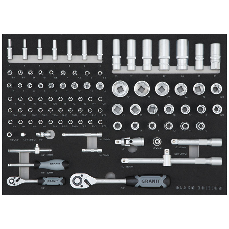 Sada nástrčných hlavic Black Edition 95 ks – 1/4" + 1/2" – vložka do dílenského vozíku