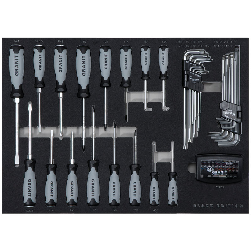 BLACK EDITION 36 ks – profesionální sada šroubováků, úhlových klíčů, bitů a háčkového nářadí v precizní pěnové vložce je ideální doplněk do každé dílny či servisního vozíku. Organizér poskytuje perfektní přehlednost, rychlý přístup k nářadí a maximální efektivitu při práci. Sada obsahuje kompletní výběr nářadí pro práce na zemědělské technice, automobilových opravách, strojích, elektroinstalacích i běžné údržbě v dílně.